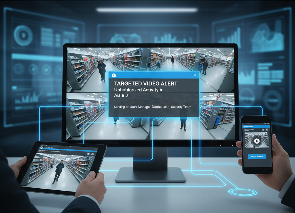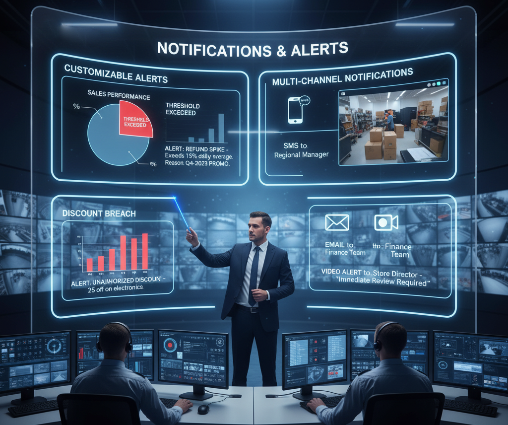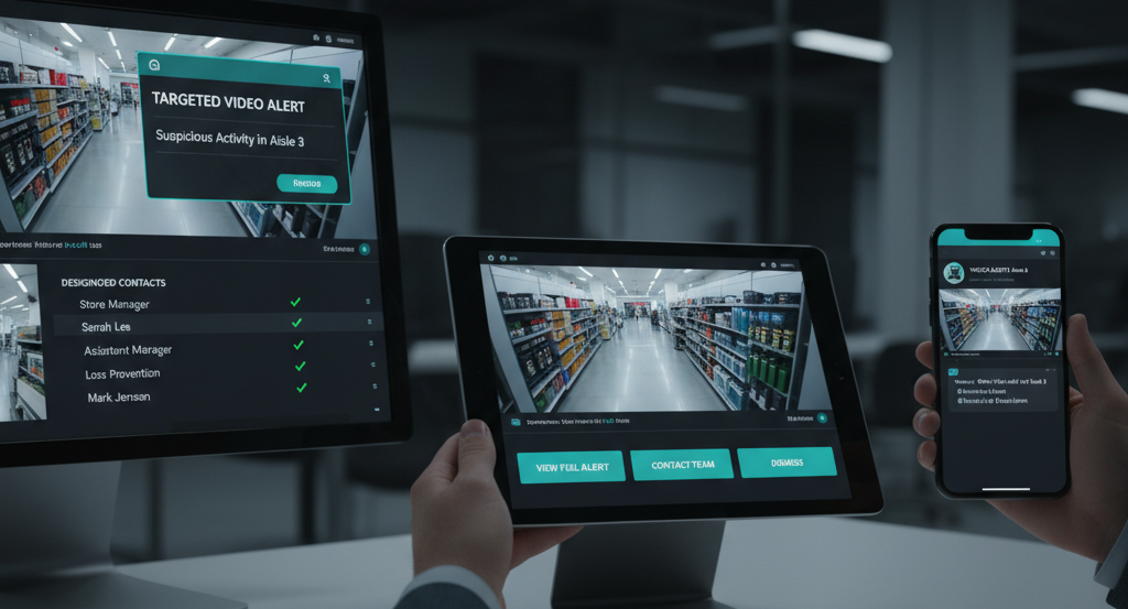 Multi-channel notifications (SMS, email, video alerts) sent to designated personnel.